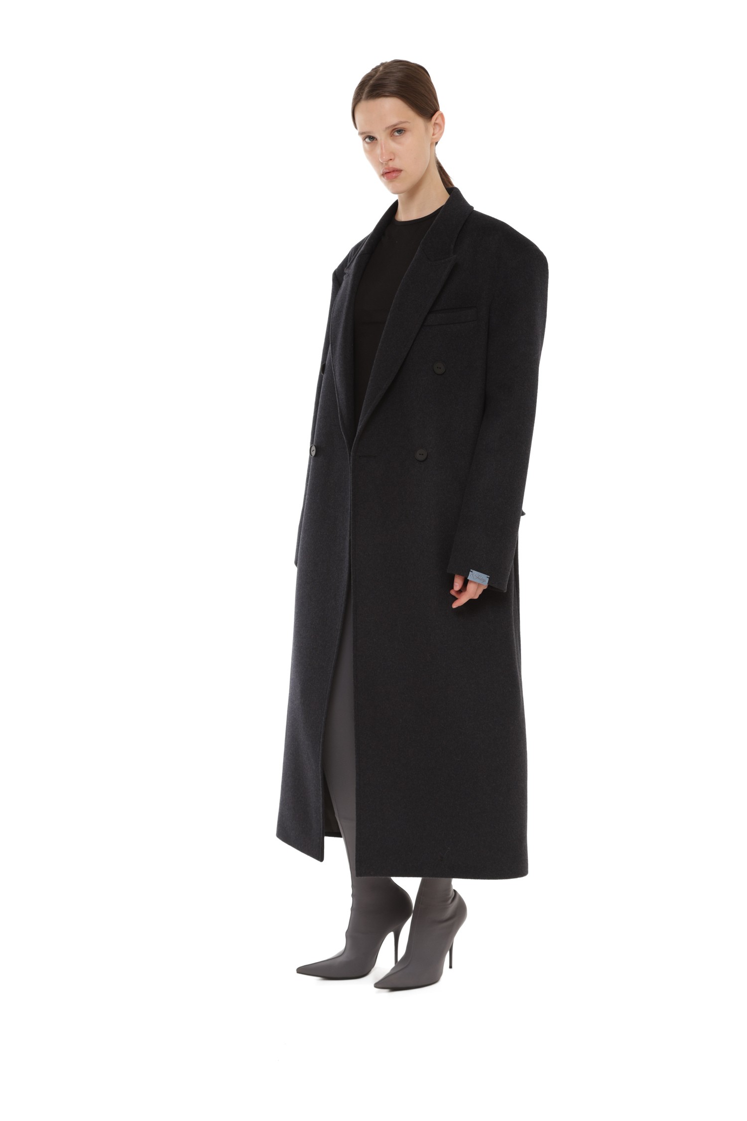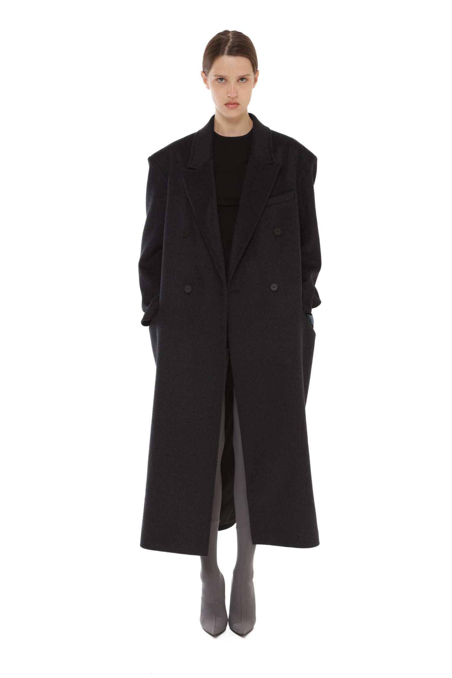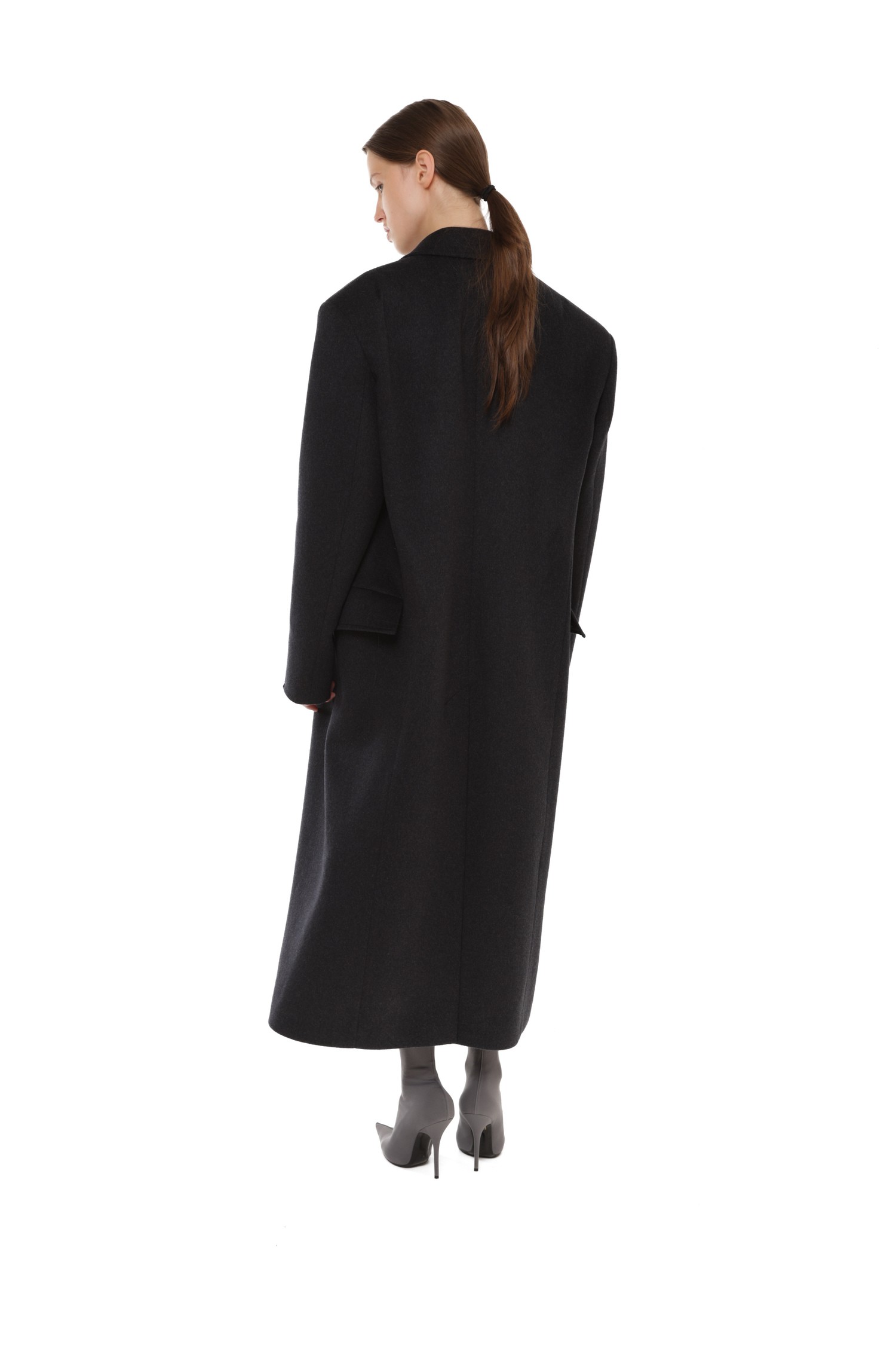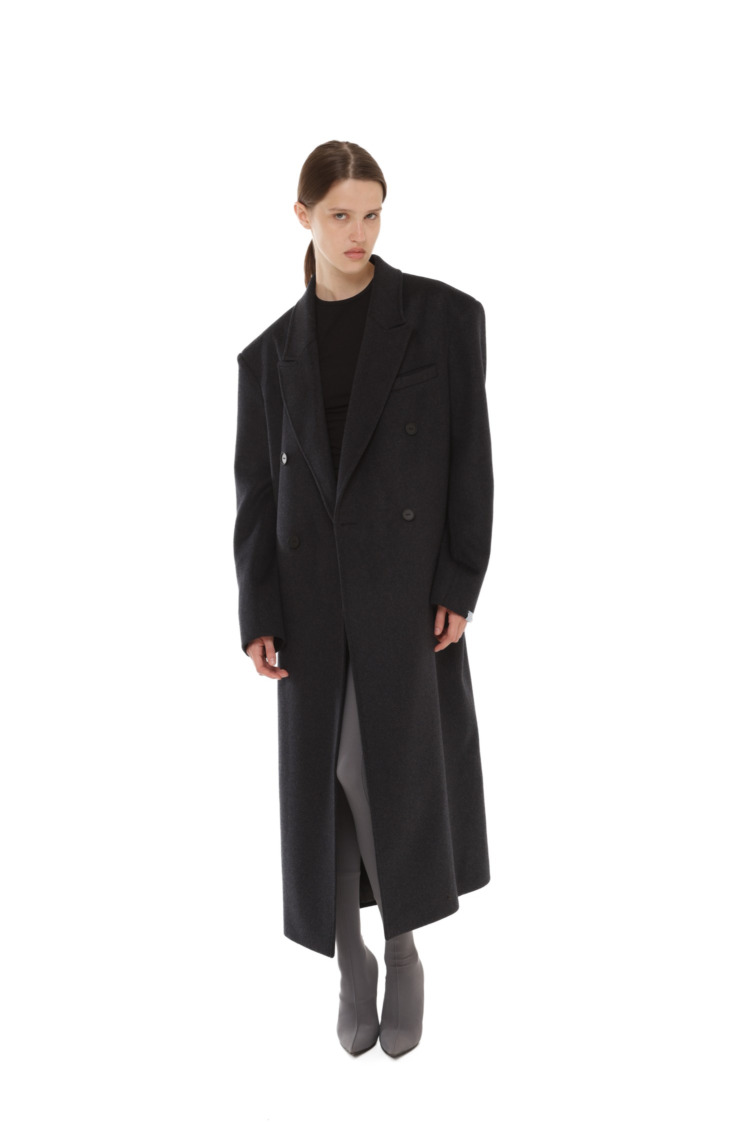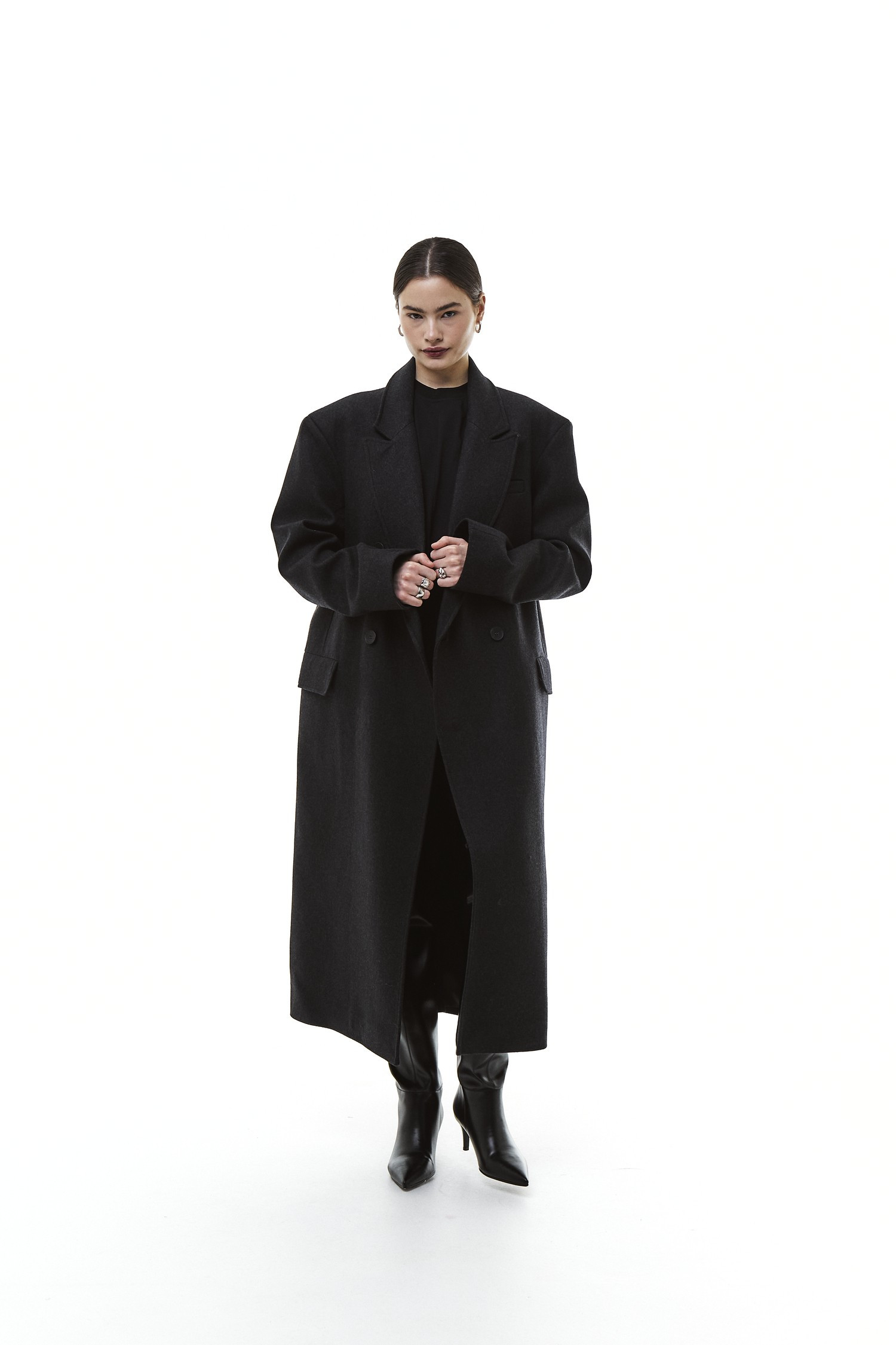 Дедово пальто в глубоком и благородном цвете графит ー это про силу спокойствия и уверенность в себе. Его гипердлинный силуэт, акцентное плечо и оверсайз-крой создают образ, в котором строгость сочетается с легкой романтичностью. Этот оттенок словно вобрал в себя дымку мегаполиса и прохладу осени, превращая каждую прогулку в маленькую кинематографичную сцену.