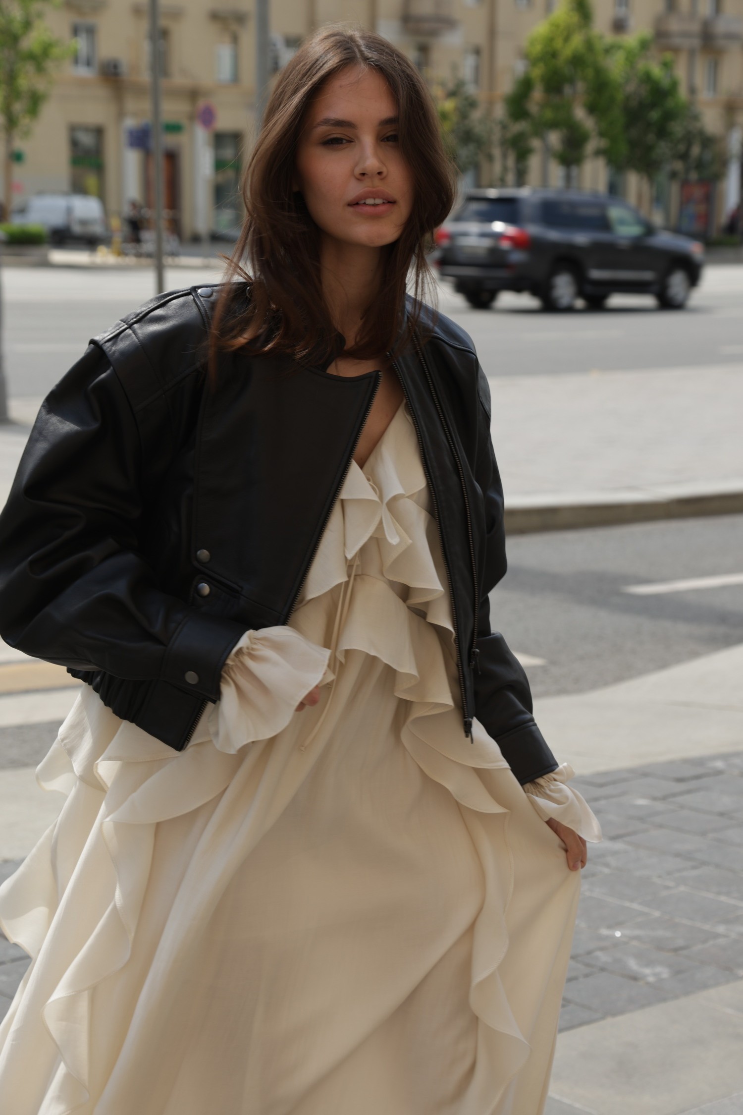 Куртка универсальна: она усиливает любой образ — от расслабленного бохо-платья до строгих брюк или любимых джинсов. Лёгкий вес, тщательно обработанные швы, съёмная декоративная деталь и практичные карманы делают изделие не просто стильным, но и функциональным. Каждая линия, каждый акцент будто создан для того, чтобы подчеркнуть вашу индивидуальность. Это та вещь, к которой рука тянется сама — настолько она комфортна, пластична и выразительна. Куртка не спорит с вами, а подчёркивает настроение: дерзкое, уверенное, спокойное — любое, которое выбираете вы.