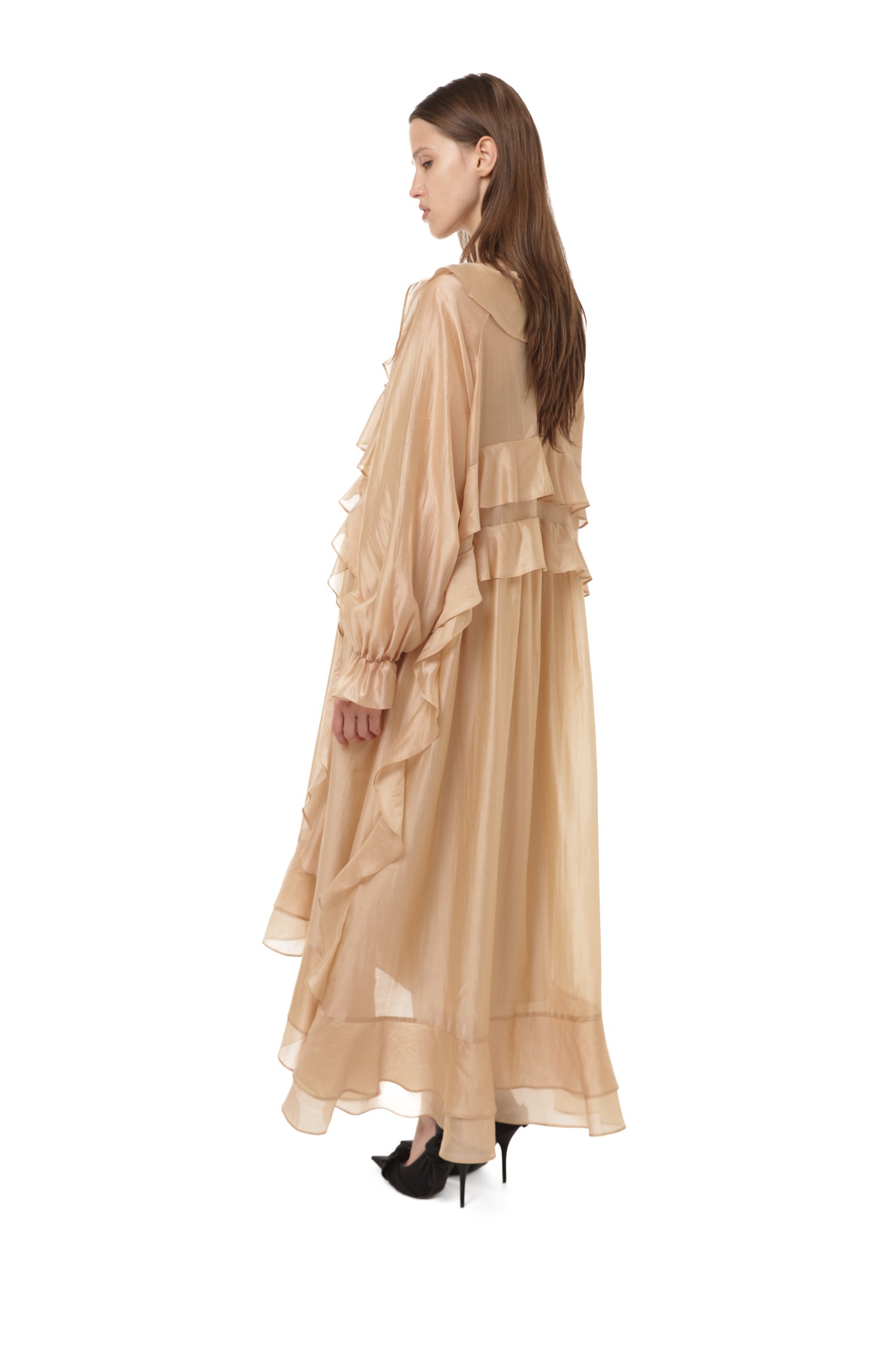 Представьте платье, в котором каждое движение превращается в мягкий, почти хореографический танец. Бежевое платье с воланами откликается на поворот плеча, на лёгкий шаг, на колебание воздуха — ткань струится по силуэту, создавая ощущение живого, дышащего образа. Нежный оттенок добавляет спокойствия, тепла и природной гармонии, а продуманные линии делают посадку женственной, летящей и очень естественной.