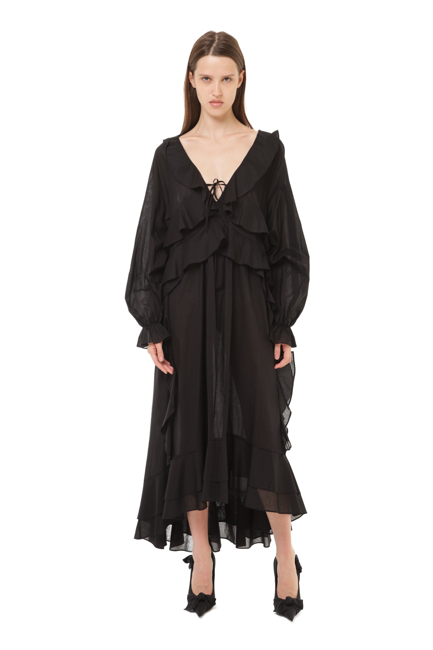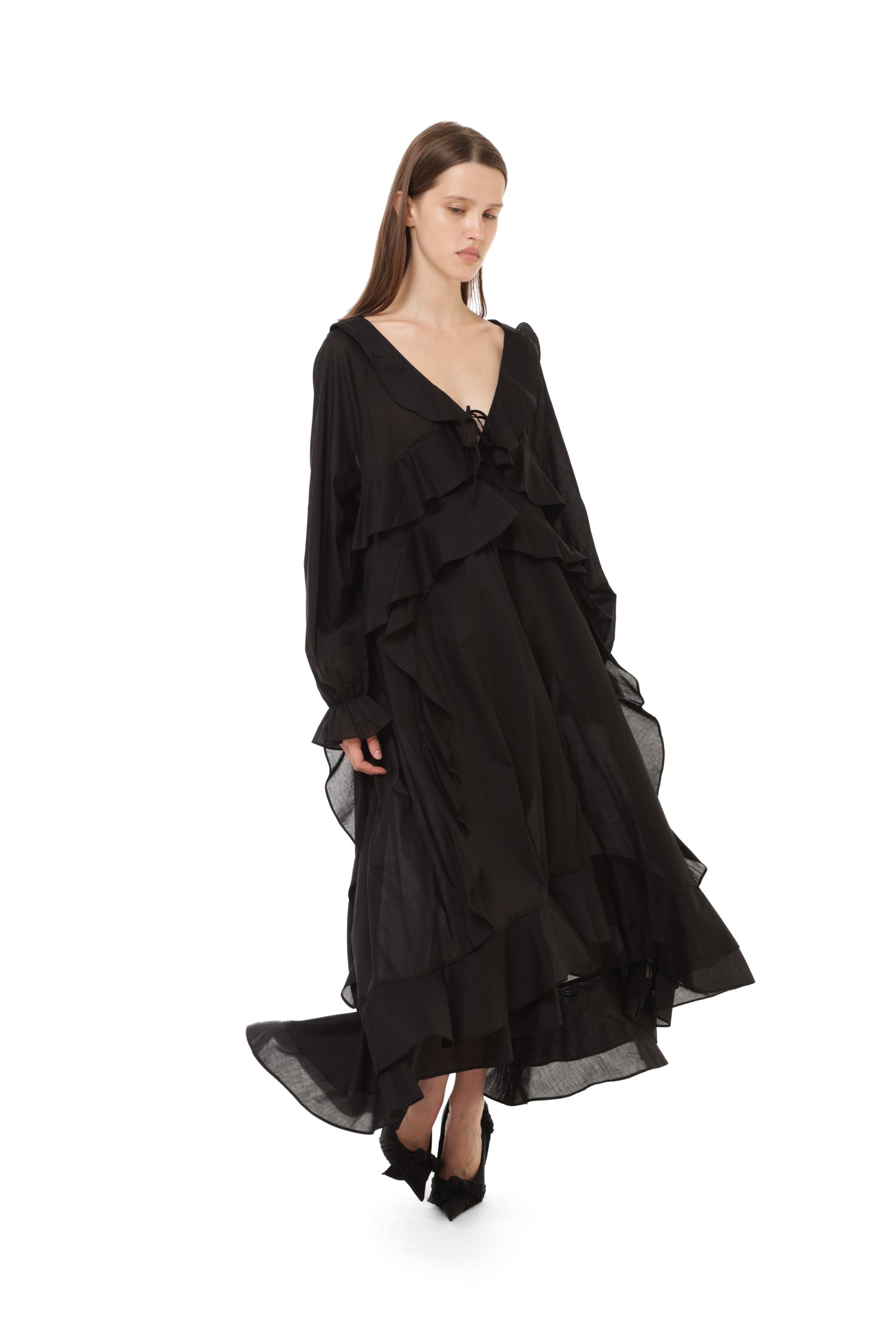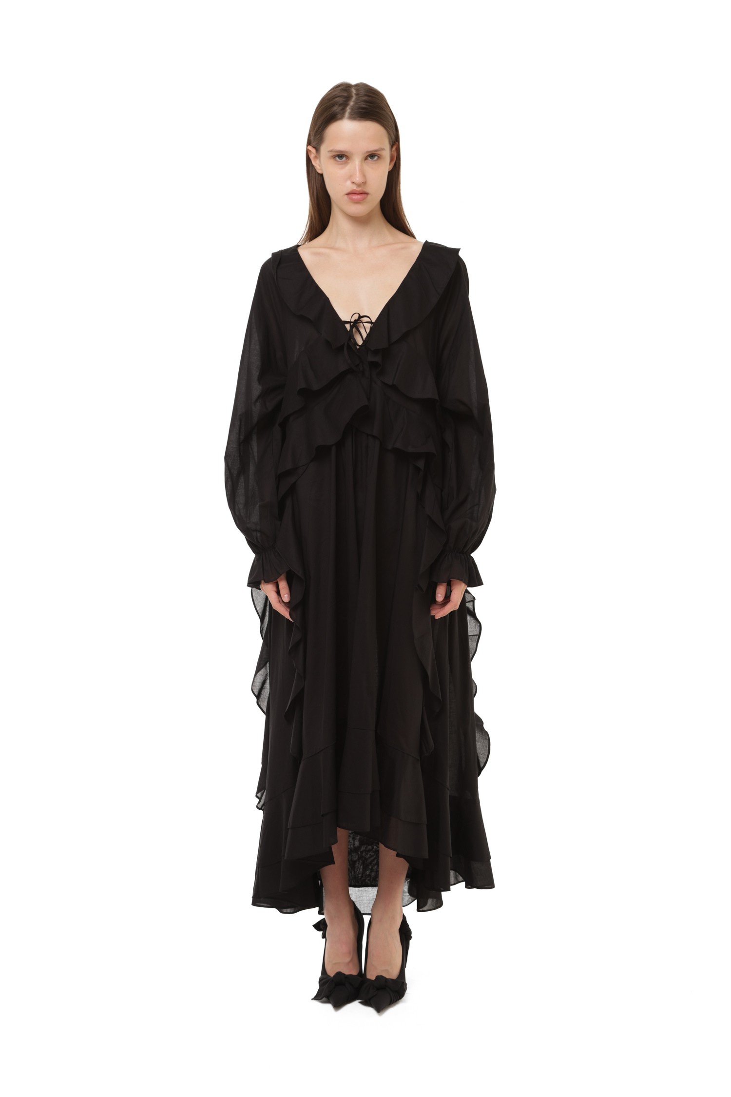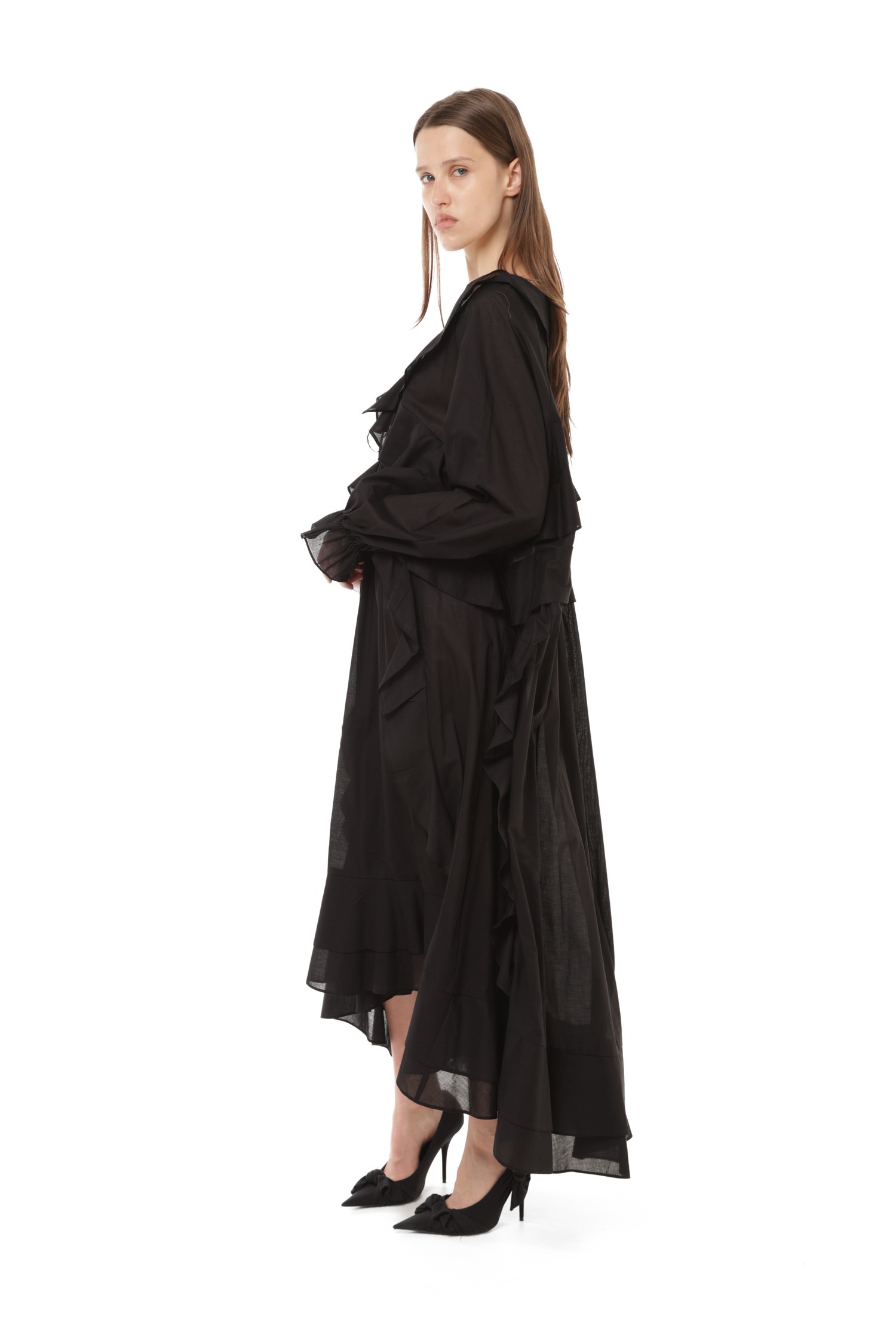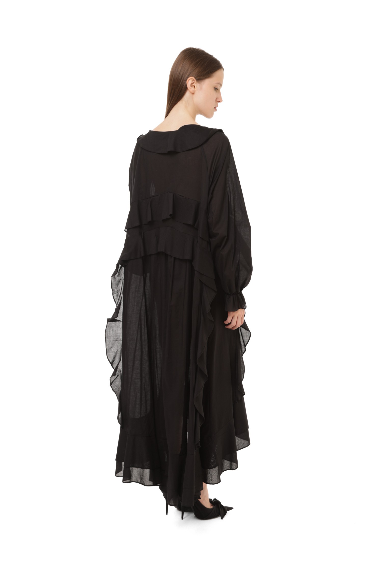 Представьте платье, в котором каждая линия наполнена драматичностью и утонченностью. Чёрный цвет делает силуэт более выразительным, а воланы создают движение, которое выглядит почти кинематографично. Оно сочетает мягкость тканей и уверенность цвета — образ получается сильным, но очень женственным.