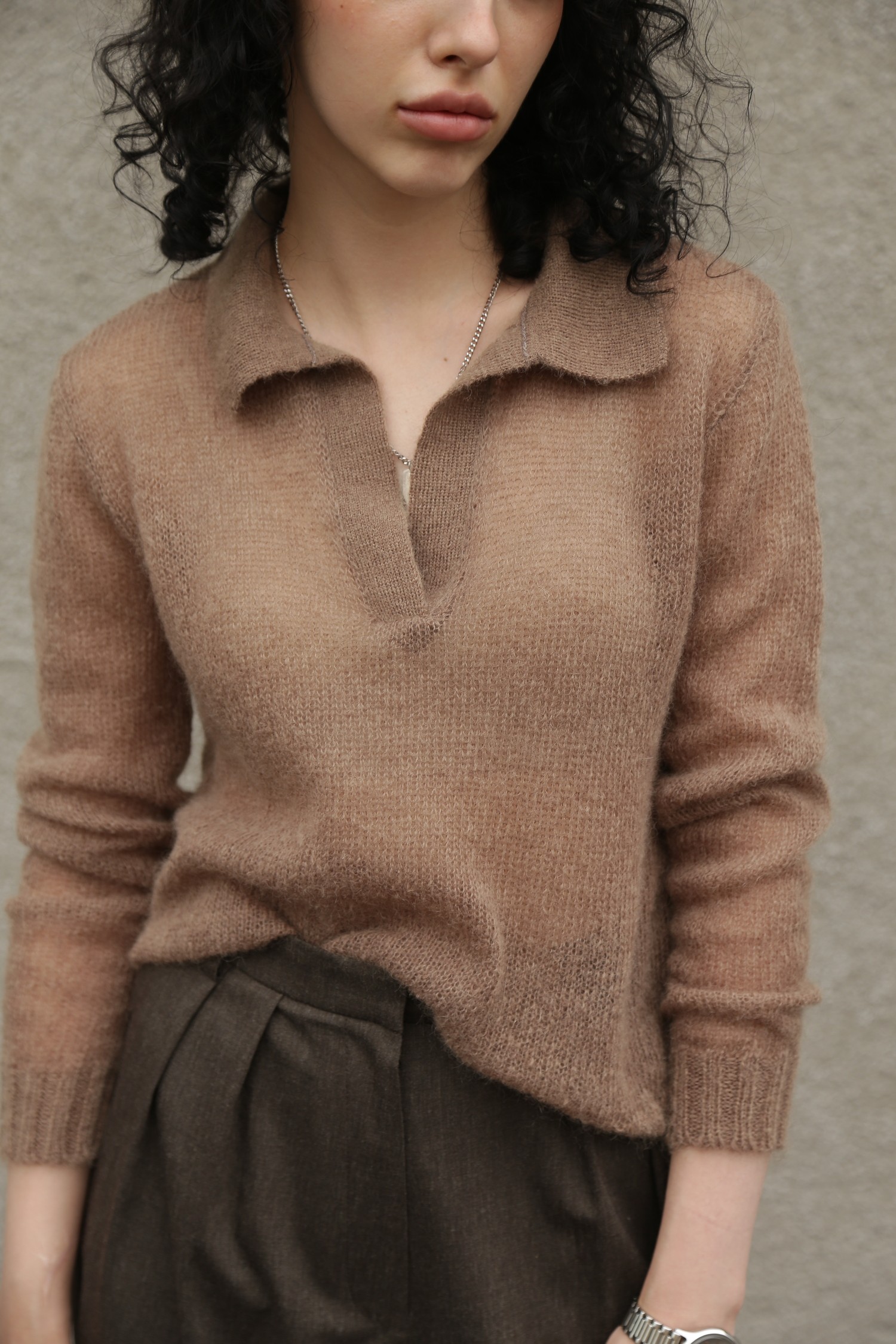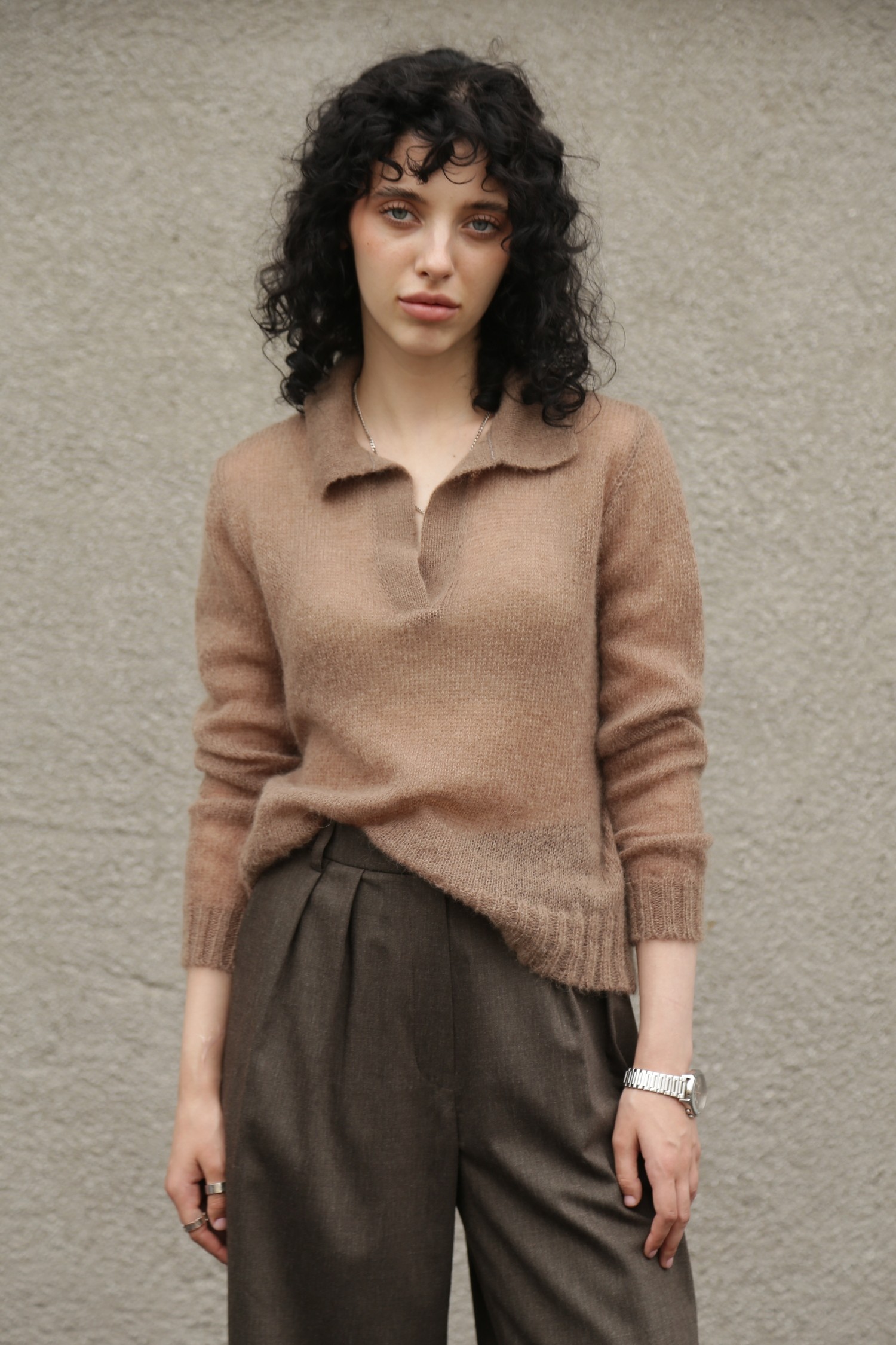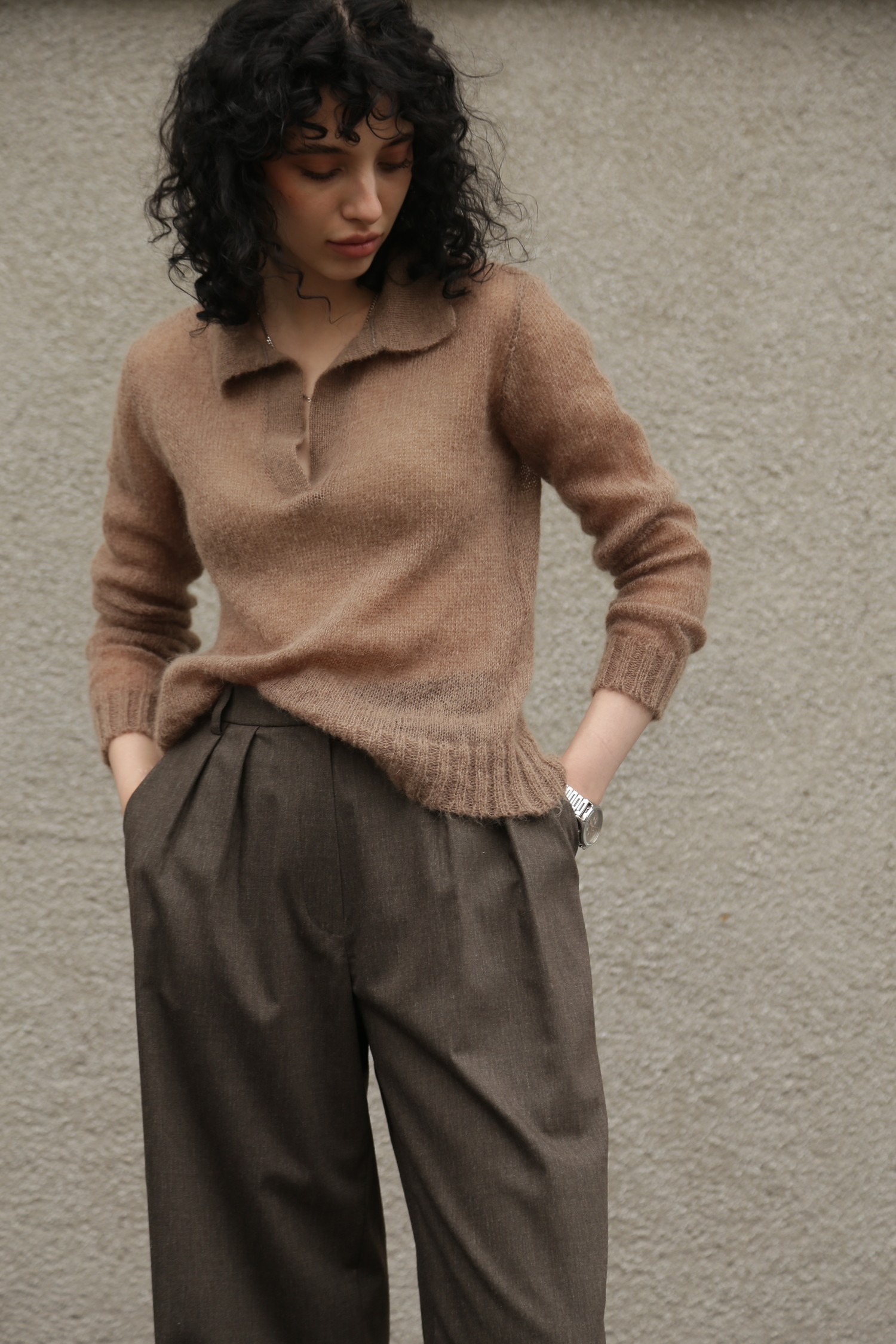 Представьте себе джемпер-поло, который словно создан для тех моментов, когда хочется замедлиться и почувствовать мягкость мира вокруг. Его бежевый оттенок — тёплый, спокойный, глубокий — будто переносит вас в пространство, где всё становится мягче: свет, воздух, настроение. Мохер делает ткань воздушной и пушистой, создает ту текстуру, которая не просто согревает, а окутывает ощущением уюта, как любимый плед, накинутый на плечи в ранний осенний день.