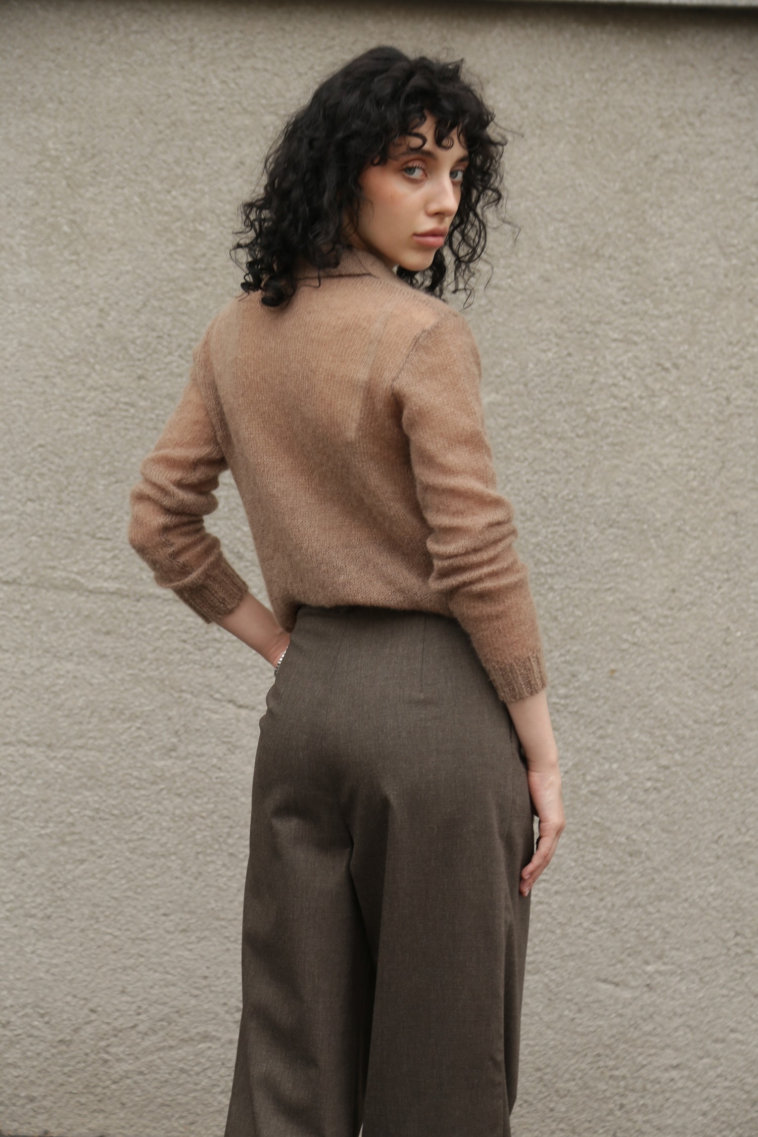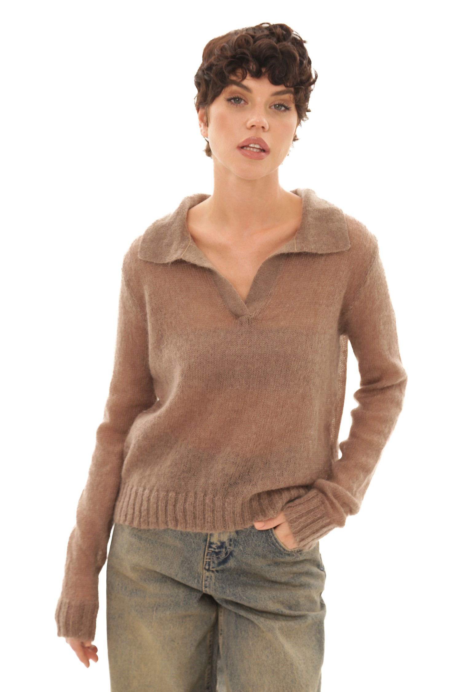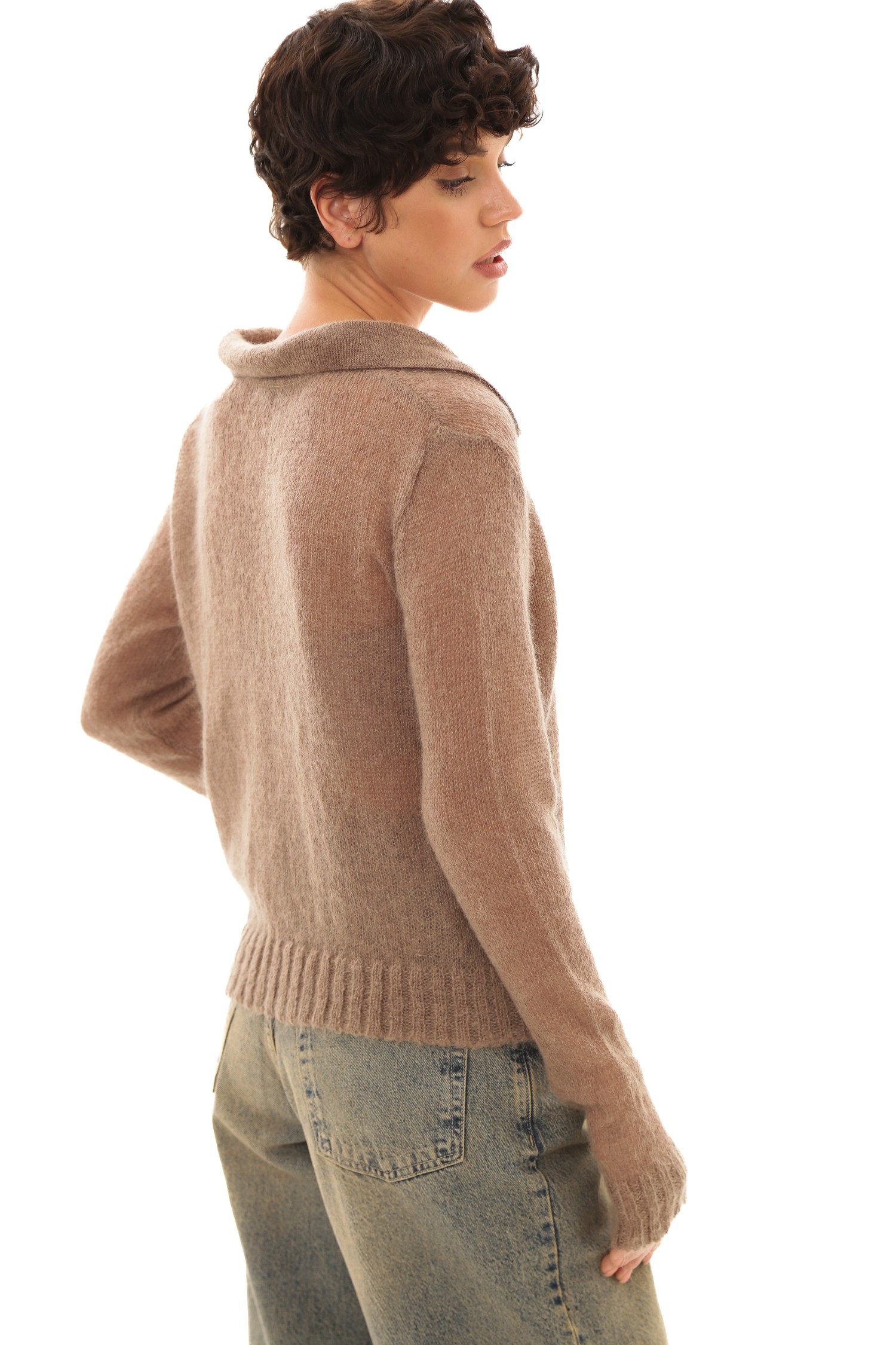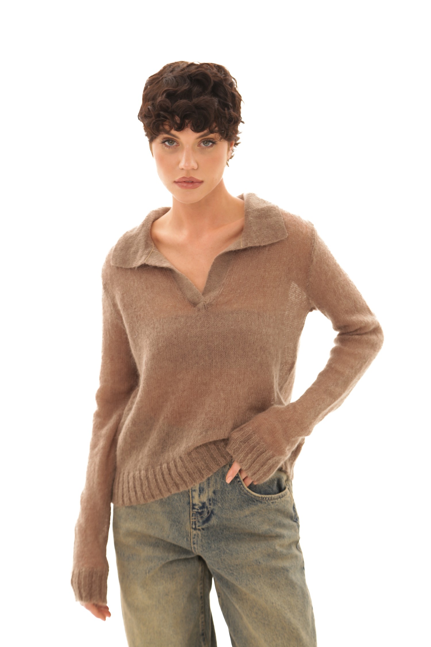Представьте себе джемпер-поло, который словно создан для тех моментов, когда хочется замедлиться и почувствовать мягкость мира вокруг. Его бежевый оттенок — тёплый, спокойный, глубокий — будто переносит вас в пространство, где всё становится мягче: свет, воздух, настроение. Мохер делает ткань воздушной и пушистой, создает ту текстуру, которая не просто согревает, а окутывает ощущением уюта, как любимый плед, накинутый на плечи в ранний осенний день.
