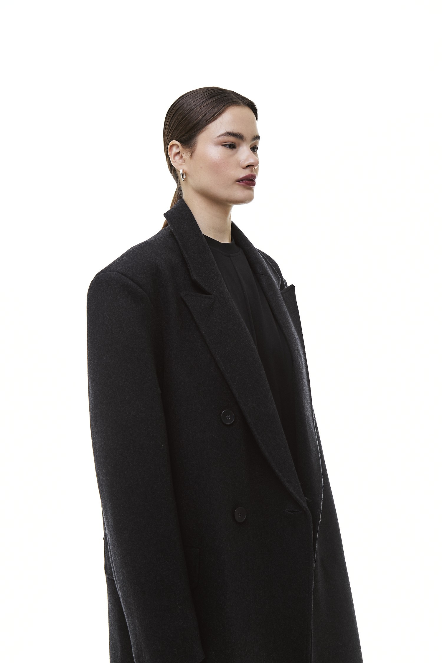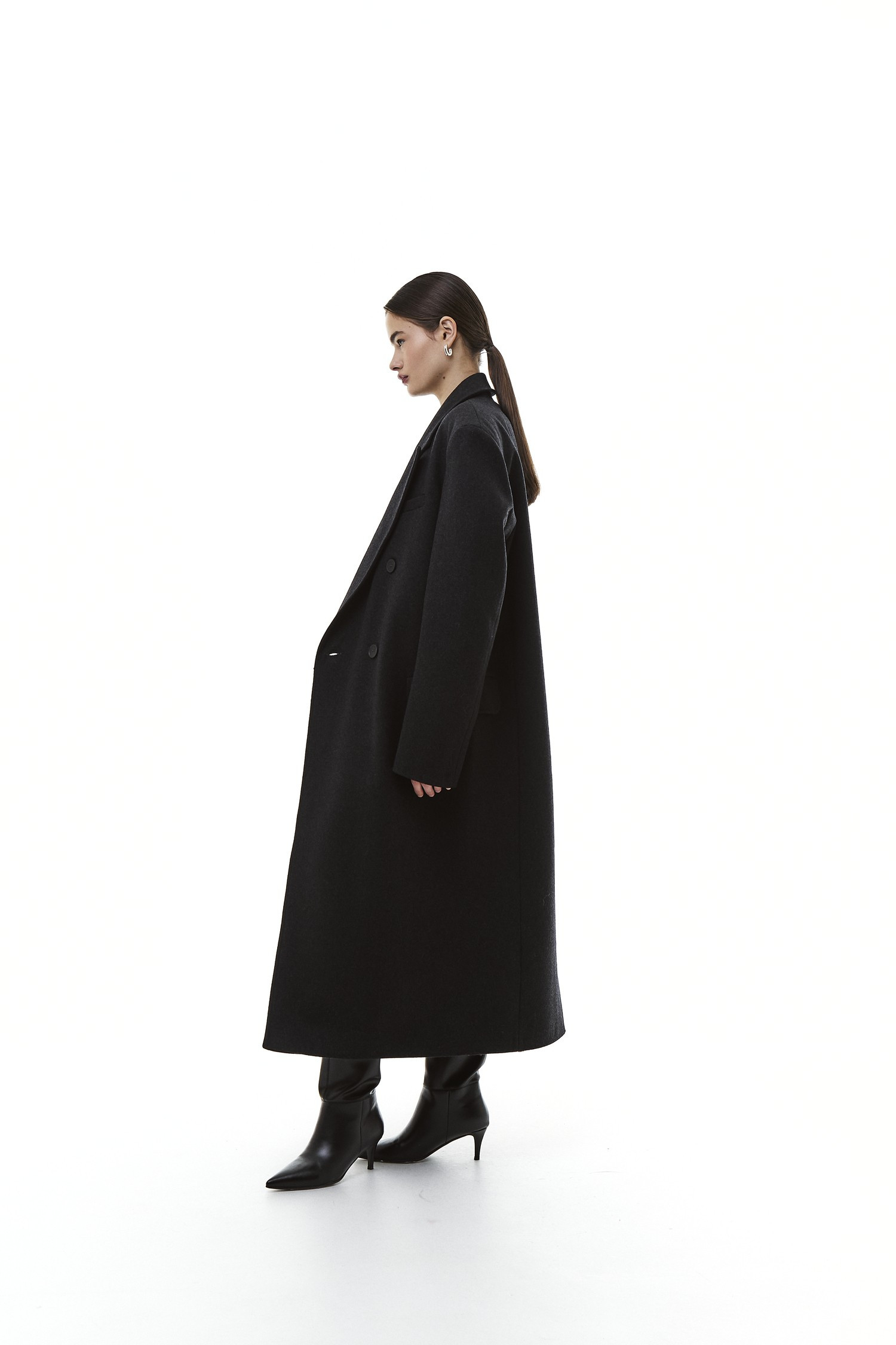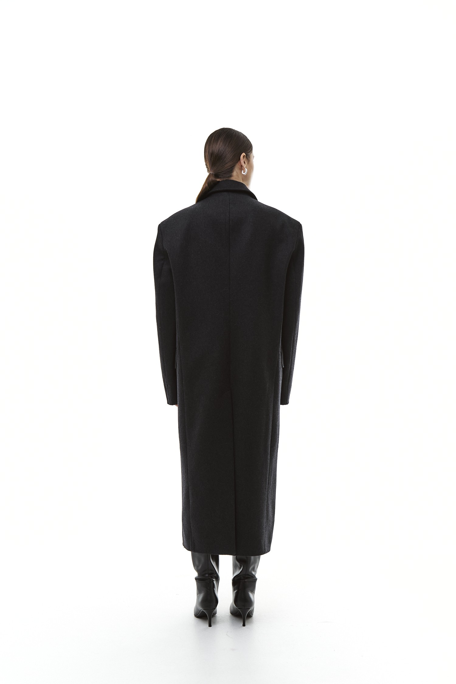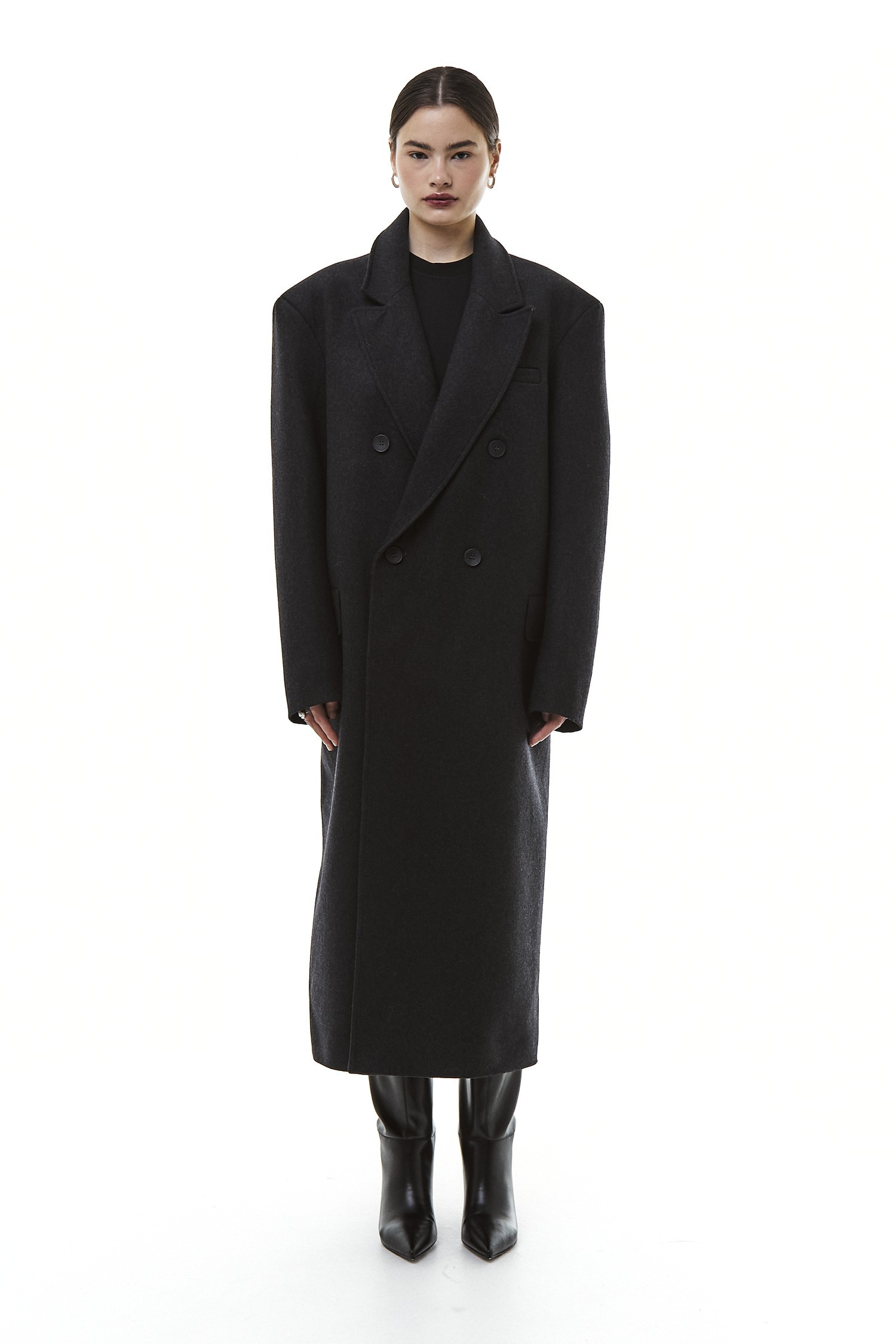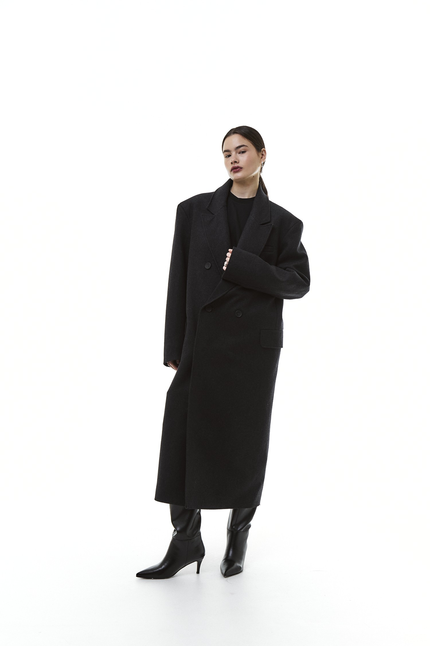 Это пальто будто хранит память о заботе, о зимних прогулках и горячем чае дома. При этом его современный крой делает образ актуальным и стильным — без излишней строгости, но с чувством формы. Оно одинаково органично смотрится и в городских декорациях, и в атмосфере уикенда за городом.